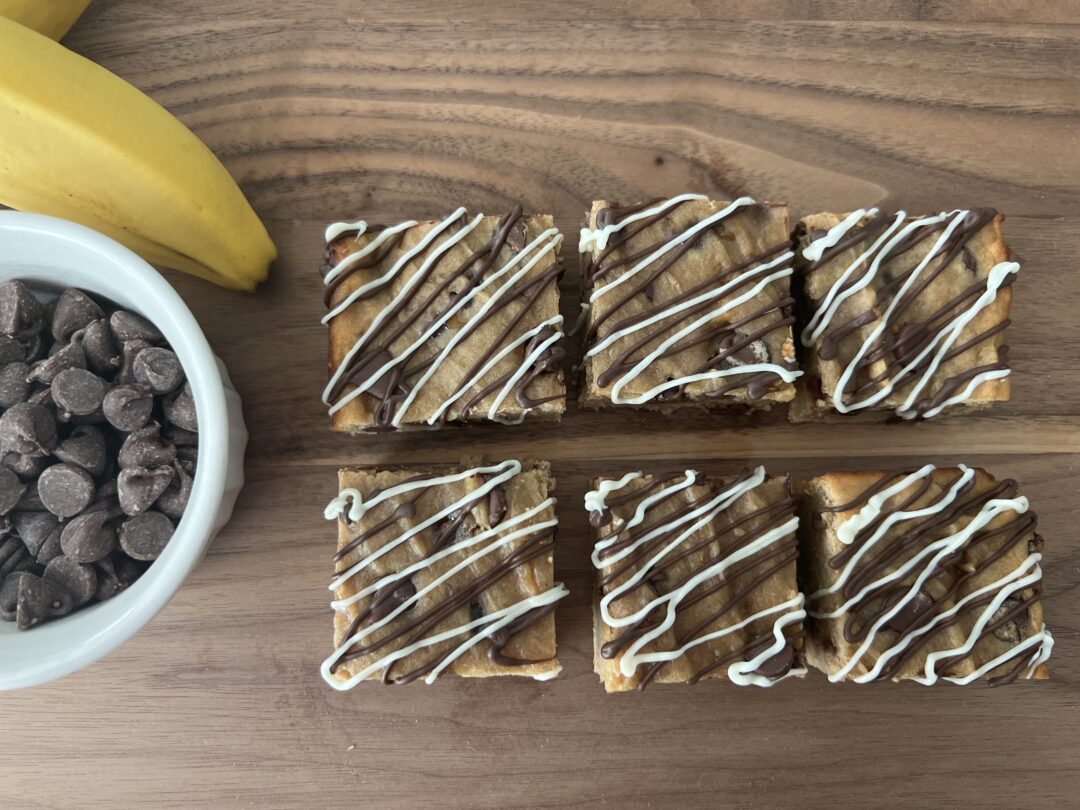 TIP: If you’re serving your peanut butter banana blondies to guests, a chocolate drizzle is a nice touch. It gives them a little texture and a presentable and professional appearance. Simple microwave melting chocolates in a microwave-safe bowl in 30-second increments until melted and smooth, then pour into a piping bag. Cut off the tip, then drizzle over your bars.